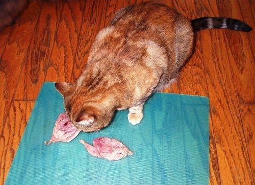 *化冻完要立即喂食哦,如果半小时内猫子没吃完,就要把肉收走。