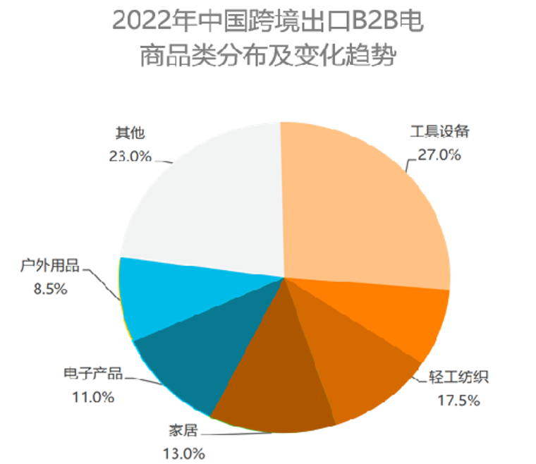 2.中国跨境出口B2B品类结构及变化趋势凭借制造业优势,工具设备、轻工纺织和家居产品稳居跨境出口B2B品类高位,多年的生产运营经验为这些品类的出口提供了良好的产业基础,产品分布现状短期内会保持稳定。