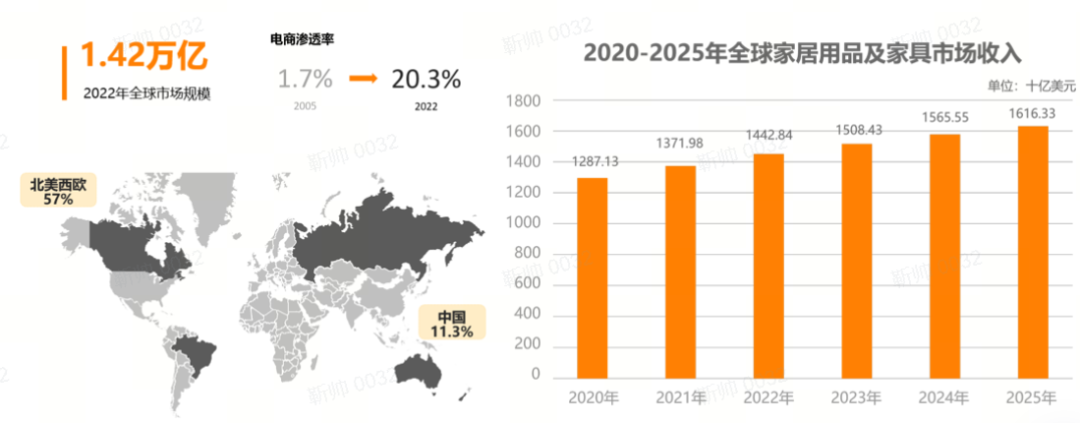 全球大家居市场2022年规模1.42万亿美金,同时保持着6.4%的CAGR增长效率。从销售渠道机会上,电商渠道保持着21%的CAGR增速,达到20.3%的电商渗透率,仍有巨大的可渗透空间