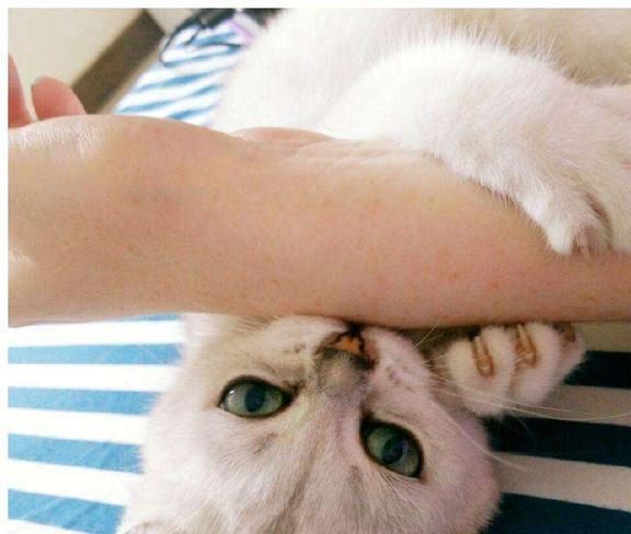 对策: 当猫咪这样咬你是时候,你可以顺手把手指戳进它的喉咙,让他形成咬人是会恶心的条件反射。