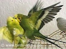 一般情况下,两个男人之间的战斗,总是发生在一只小美女旁边。最初两个角斗士先是威胁一下对方(见本节正文前所列地址,详见11、7 威胁警告),耀武扬威一下,打击一下对方的自信心。如果其中一只觉得自己落下风了,他会立刻反击,如下面视频所示(见本节正文前所列地址,图为视频截图)。接着,如果两个勇士都没有放弃的意思,那就要警告一下对方了,两人站得很近,几乎吻上,咕咕咕咕咕(见文前地址,详见13、皮皮的声音)~~~再抖抖翅膀(见文前地址,详见11、10 翅膀颤抖抽动),告诉对方,爷很强壮的!然后,踢,踩,抓(见文前地址,详见 11、25 我踩!我踢!我抓!),以表示爷我真的很强。不过并不是每次战斗都能看到这一步,有的鸟比较猴急直接扑上去打了。如果这时两只猛男还是都不想退缩,那就能看到小嫩嘴嘴大张(* 估计自以为那是血盆大口能吓到对方吧哈哈!!*),扑上去啦,经常能看到他们用粉红小爪爪去抓另一只鸟鸟的羽毛。这种方式的战斗,通常能看到他们在他们站的地面桌面笼顶上抱作一团滚来滚去,滚来滚去,滚来滚去,滚来滚去……(* 维萨子看到这里我YD地笑了。。。英雄抱得美人归式的战斗在吧里一个视频里有,名字好像是澳大利亚的鹦鹉世界吧好像,记不清了,我网速太慢也不好找,亲们自己找找看看吧,非常非常棒的一个视频,里面还说了凤头头,可爱史了!*)