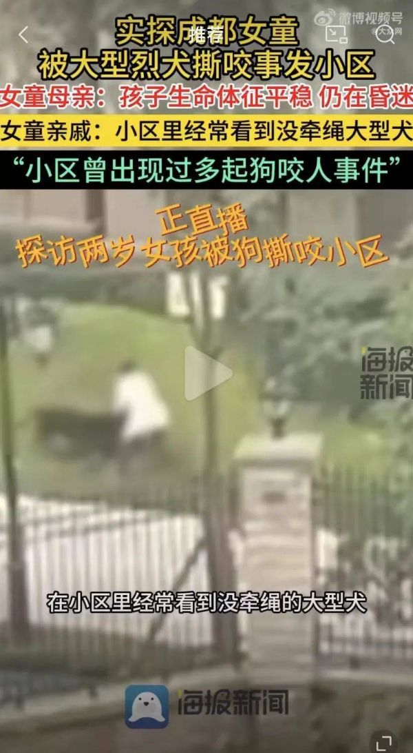 10月6日,四川省崇州市一小区内,一名随母亲下楼玩耍的2岁女童,遭到了一只未牵绳的罗威纳犬攻击。据现场视频显示,罗威纳犬对女童的撕咬长达几十秒钟,其间女童母亲虽及时做出了保护反应,但女童仍全身受伤严重,目前仍在四川大学华西医院内接受治疗。