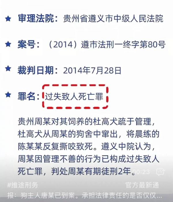 目前,狗咬人事件里的刑事案件,仍是少数。除蓄意纵狗伤人外,狗主人疏于管理导致极其严重后果的,仍可能被追究刑事责任,对此也已有司法实践。图源:视频截图