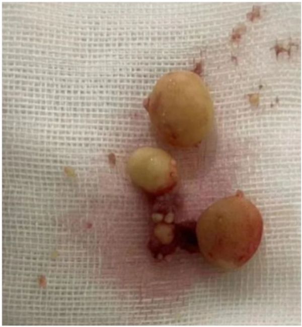 DR提示:膀胱内有两大一小结石,尿道内有一小块结石。