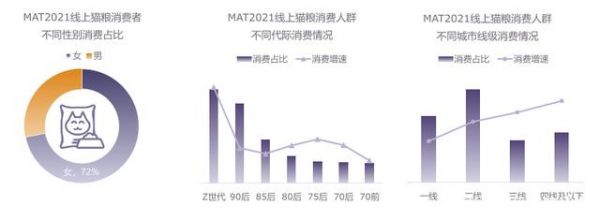 线上猫粮消费者画像显示,女性消费贡献更为突出,占比超过七成;从代际分布来看,Z世代成为猫粮消费中坚力量;养猫群体的年轻化正是体现了网络吸猫文化的流行,以及猫咪更适应年轻群体情感与陪伴需求的特质。