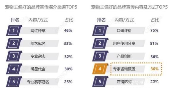 从品牌营销的媒介渠道上来看,网红种草、综艺冠名以及专业杂志的推广更能引起宠物主的关注;而从宣传内容上,除了传统的用户口碑、使用分享、产品创新之外,已有近四成的消费者开始寻求专家的咨询服务。专业知识教育成为品牌与消费者交流的新方式,帮助品牌建立专业形象,实现双赢。