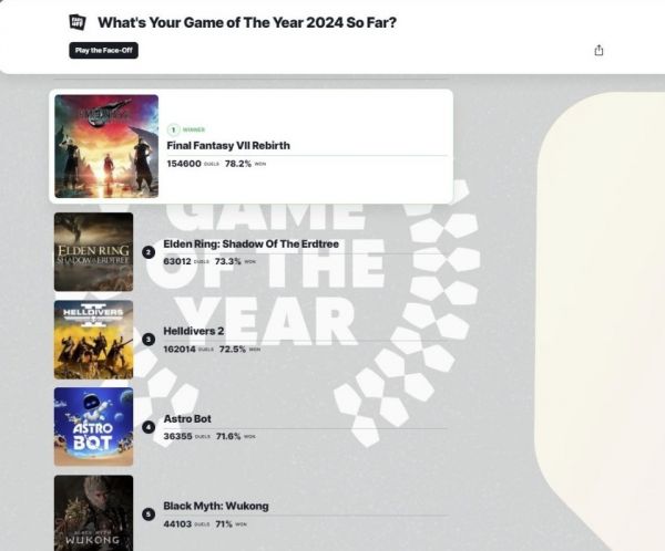 具体票选结果如下,第一名是《最终幻想7:重生》,以78%的得票率高居第一,第二名是《艾尔登法环:黄金树幽影》,得票率是73%,第三名是《绝地潜兵2》,得票率72.5%,第四名是《宇宙机器人》,得票率71.6%,第五名《黑神话:悟空》,得票率71%。后面第6-10名分别是《龙之信条2》、《剑星》、《战锤40K:星际战士2》、《黑帝斯2》和《如龙8》。不过从第六名开始,得票率就低于70%了,《龙之信条2》只有63%的票数占比。