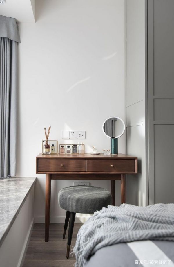 卧室主要以浅灰色为主,温柔又不失干净,搭配木质家具更加贴近自然。在卧室还增设了大面积的衣柜和化妆区,窗边的飘窗也成了狗子们和主人经常呆的地方,小巧又十分的实用。