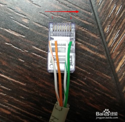 把水晶头按图中所示拿在手上,从左到右依次是12345678根金属片,也是网线接法顺序。