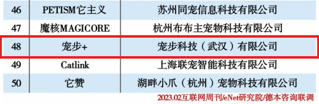 2023年2月德本咨询、互联网周刊、eNet研究院联合发布了2022中国宠物行业50强,宠步科技有幸入选,位列于第48位。近两年来受疫情影响,线下业务几乎全线暂停,因此排名较以往有所下降。