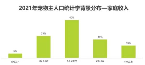 在宠物主收入方面,两份白皮书的数据相差较大,估计调查的人群不同,按每个家庭2人作为收入主力计算,下图第一张数据显示,8000-20000元收入的家庭占据主力,达到47.6%,下图第二张数据显示,家庭收入在1.5-2.5万元收入的家庭占据主力,达到了40%。
