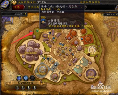 首先是使用达拉然炉石回到达拉然城堡,然后按‘M’打开地图。可以看到在达拉然城堡的左上角有个绿色爪子的标记,鼠标指上去会提示世界任务的结束时间以及奖励物品。
