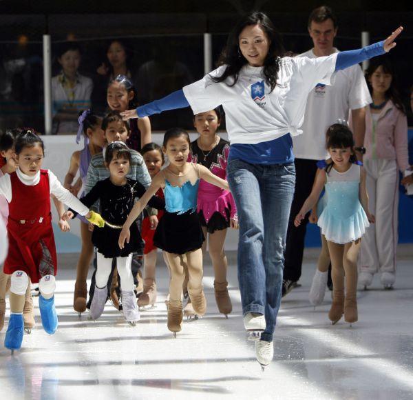 2007年4月24日,陈露(前)在北京举行的俄罗斯索契2014申奥宣传活动中为小朋友进行花样滑冰指导。 新华社记者 廖宇杰 摄