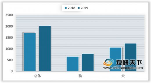 2019年我国犬猫类宠物消费市场规模冲破2000亿大关,整体消费规模达到2024亿元,同比增长18.5%;宠物犬消费市场规模为1244亿元,同比增长17.8%;宠物猫消费市场规模为780亿元,同比增长19.6%,超过犬消费市场规模增速。