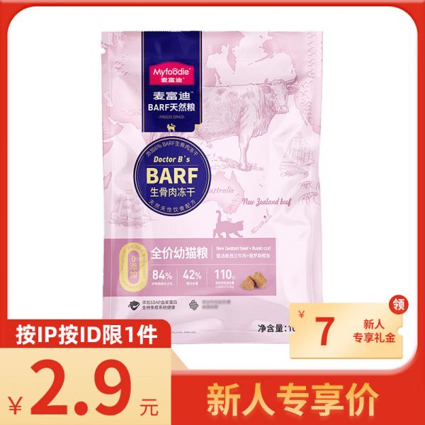 针对新手常遇的小猫肠胃问题,如玻璃胃、软便拉稀等状况,麦富迪barf猫粮中特别添加超110亿活性益生菌,有效呵护猫咪娇嫩肠胃。