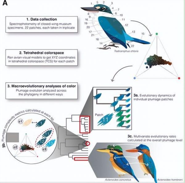 个体鸟类的羽毛复杂性和颜色的种间差异通常被认为是颜色多样性的不同轴,然而,已经进化出几个斑块的物种有更多的自由度来变化,这可能导致物种之间更快的颜色进化速度,然而,情况并不一定如此,因为翠鸟体内有一些例子显示出简单的羽毛但高度的颜色分歧,以及进化差异很小的复杂羽毛。