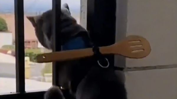 猫咪顶着飞机耳看着主人,女生正问怎么了 狗子窜了上来
