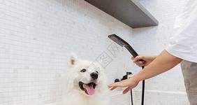 在梳理完毛发之后,我们需要用清水彻底冲洗干净萨摩耶的全身,避免留下洗澡液的残留,刺激它们的皮肤。