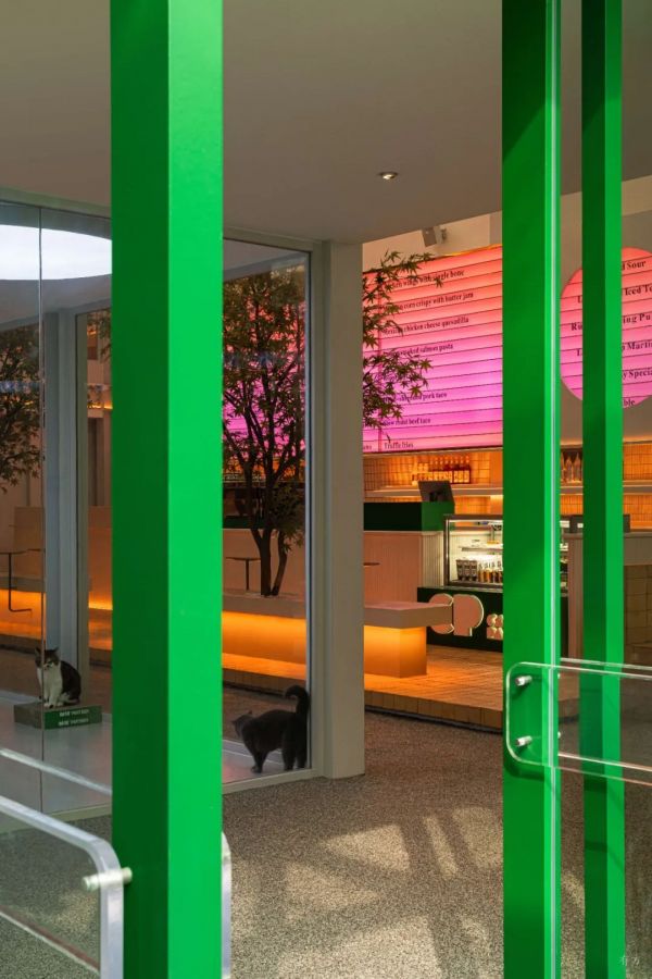 CARE PARTNER入口 摄影:李恒作为品牌与设计师的第二次合作,成都CP延续了杭州首店的微生态观念,在对流浪宠物关照的基础上,拥有自己独特的风格表达:引入全天候生活场景的串联,借助多媒体灯光的延续,在现场体验的丰富感受之上,用咖酒模式的新思路形成本土表达的力量,为社交场景带来丰富有趣的体验。