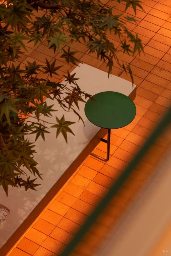 CP入口的宠物休息站 摄影:李恒沿街设置几张外摆的桌椅,在咖啡馆中已屡见不鲜。而本案将过渡灰空间变成了社群休闲的自发聚集地,以“绿色站台”为概念,将室外区域打造成半开放的公共空间。在设计上使用圆形的镂空天顶向酒店落客区的概念致敬,为丰富的灌木植被开辟自由生长的空间。天顶下方的不锈钢支架增加了贴心的横杆设置,方便作为宠物牵绳的固定点着力。