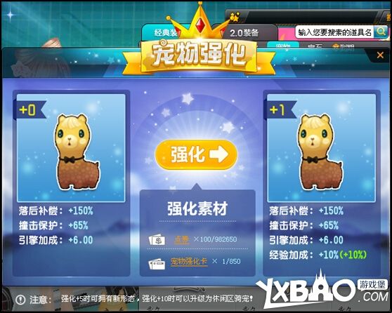 另外:不同宠物强化所需要消耗的宠物强化卡和点券数量都可能不同,如果强化失败了的话,系统会为你返还经验、道具等奖励。消耗的强化卡越多,强化失败返回的道具也会越多;