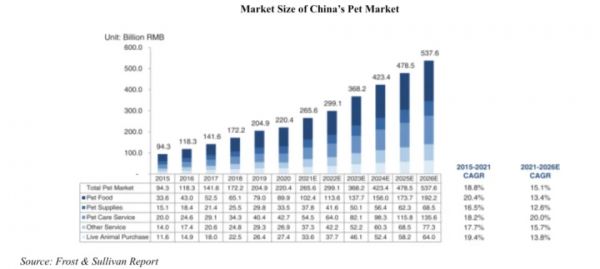 近年来,随着人均收入逐渐增长,少子化、老龄化趋势逐渐加深,中国宠物市场正飞速发展。弗若斯特沙利文披露的数据显示,2021年,中国宠物市场规模为2656亿元,2015年以来的复合年增长率为18.8%。预计2026年,中国宠物市场规模将达5376亿元,2021年-2026年的复合年增长率为15.1%。