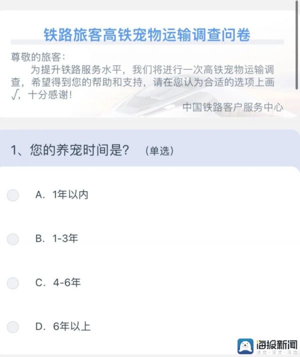 5月10日,海报新闻记者致电12306客服,工作人员表示,确实有这个问卷,现在需要征集旅客们的建议,看看以后是否可以优化。网络上,不少养宠物的网友表示都填写了问卷,非常期待这项措施的实行。