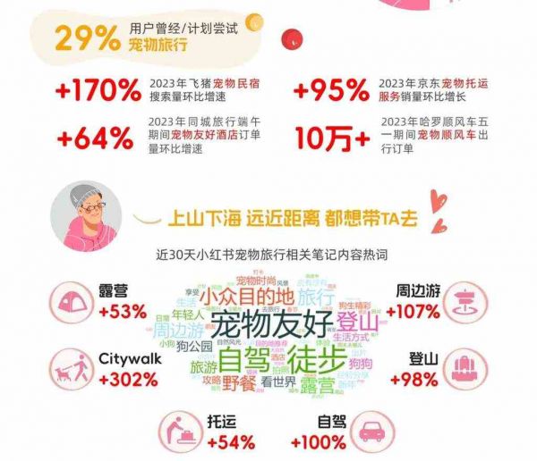 高线城市的年轻人也自有一套爱宠、养宠法则。在小红书刮起的露营旅行热潮中,携宠旅行家们也开始规划带着宠物出门看世界,宠物民俗、宠物托运、宠物友好酒店、宠物顺风车的热度不断攀升。