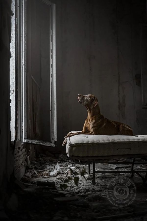 比利时废弃环境(荒废酒店)中一只狗的令人伤感的影像。用 Z9 ,50mm 拍摄。光与暗的对比,衬托出狗的线条以及建筑物的废弃状态。