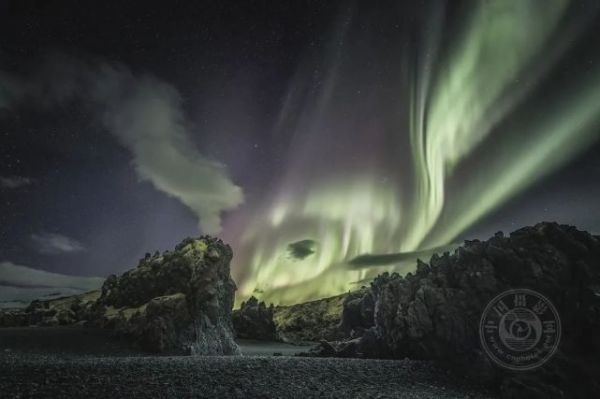 站在G2 级太阳风暴推动的北极光下,是我摄影师生涯中最壮观、最有意义的时刻之一。漩涡状的极光似乎是从左边的头形岩石中冒出来的,上面的云就像一支枪,我想了想,最终确定了施法者的名字。这幅作品是由两张依次拍摄的照片组成,一张短曝光的照片定格星星和漩涡状极光的特征,一张长曝光的用来捕获较暗的自然光前景。