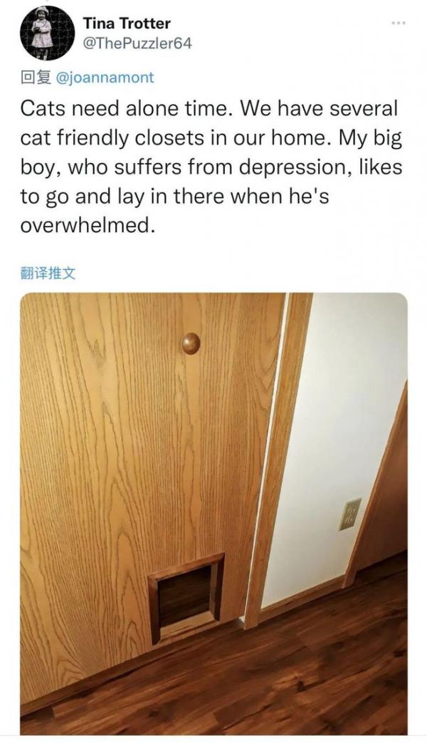 “猫咪需要独处的时间。我们家里安装了几个适合猫咪的柜子,我家的老大有抑郁症,它焦虑的时候,就会去哪里躺着。”