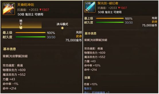 (1)毕业武器方面,由于剑魂与普通模式团本同步推出,因此首选毕业武器肯定是团本的“沧海长风光剑”,唯一缺点是不附加属性伤害,可附魔火卡;其次深渊武器推荐“天脊乾坤剑”,更次一级则推荐“聚光剑-破幻者”。
