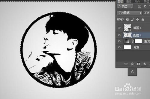新建后图层面板下方的调整图层,选择渐变,选择“黑白渐变”,样式选择径向,适当调整缩放大小,如下图: