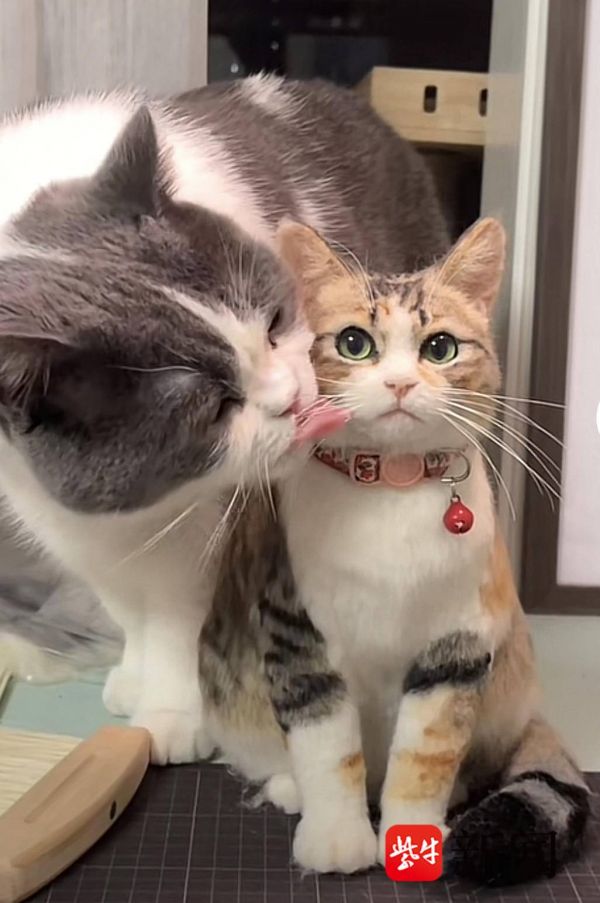 近日,家住徐州的袁女士在短视频平台上发布了几条自己亲手制作的仿真猫咪视频。视频中,一只蓝白色猫咪正在给一只小花猫舔舐胡须,画面看上去十分有爱。但仔细看,咦,小花猫怎么一直纹丝不动?哦,原来是只假猫。视频发出后网友们纷纷赞叹袁女士精湛的手艺,“看来半天原来是假的”“太像真的了,好厉害!”“栩栩如生,可以做到以假乱真”……还有不少人表示要找袁女士排队定制。