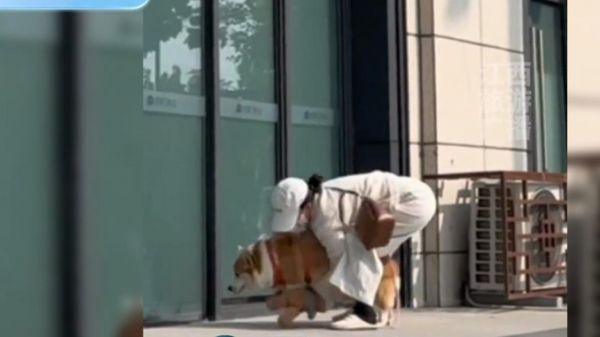 男子因赌气不准女朋友摸他的狗狗,选择背着狗狗做饭