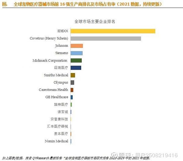 全球范围内宠物医疗器械生产商主要包括IDEXX、Covetrus (Henry Schein)、Johnson、Siemens、Midmark Corporation、Mindray、Smiths Medical、Olympus、Carestream Health、GE Healthcare等。2021年,全球前五大厂商占有大约65.0%的市场份额。