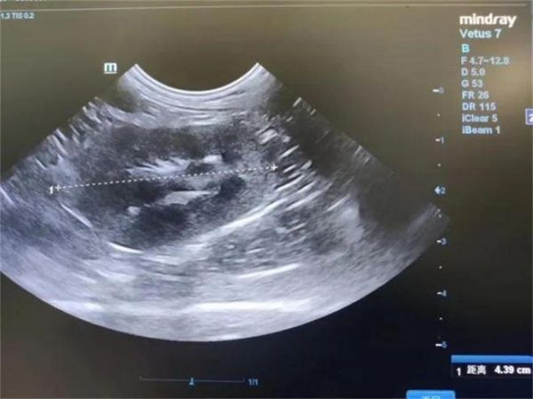 结合检查结果得知该犬炎症反应升高,无贫血情况。CRE、BUN同时显著升高,磷离子升高,提示有肾衰氮质血症。ALT轻度升高,提示轻度肝细胞损伤。血气PH<7.2,氯离子升高,二氧化碳分压≦15提示有代谢性酸中毒。胆囊内泥沙样高回声显影,提示有胆汁淤积。尿液分析尿比重下降,尿中可见微白蛋白,糖等大分子物质,提示尿浓缩以及重吸收障碍,可见颗粒管型提示肾小管损伤。影像超声提示心脏病,潜在血栓风险。特异性脂肪酶以及胰腺超声回声未见异常,排除胰腺炎可能。