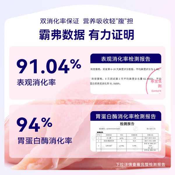 45%高鲜肉含量,契合猫咪嗅觉口感,添加110亿活性益生菌,优化肠胃环境,吸收更充分,85%源自动物性原料,粗蛋白40%,粗脂肪16%,均衡营养不致虚胖。