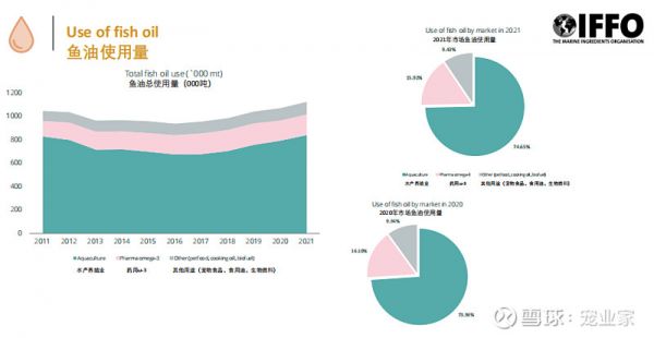 以2022年为例,2022年用于水产养殖业的鱼油总量约85万吨,主要用于养殖鲑鱼、甲壳类动物、海水鱼和其他淡水鱼等。医药领域的鱼油使用量预计年消费量17万吨-18万吨。而宠物食品的鱼油使用量达7万吨。