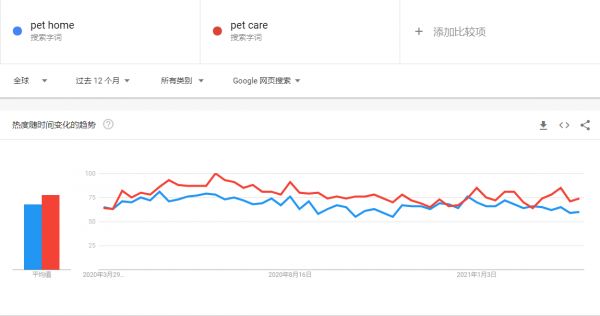 从过去12个月的GoogleTrends趋势图,宠物家居与宠物护理对比,搜索量持续保证于高位。