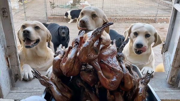 两只狗狗轮番上阵抢食,面对狗妈张牙裂齿的警告依然我行我素结果