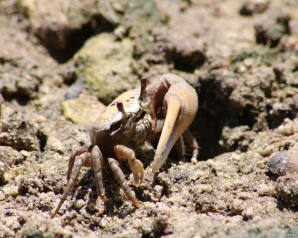 招潮蟹的躯壳会随着每天的时间而变色,特别是在潮起潮落时,它们的颜色会加深。这种变色现象使招潮蟹能够在海滩环境中更好地伪装自己,躲避捕食者的捕食。