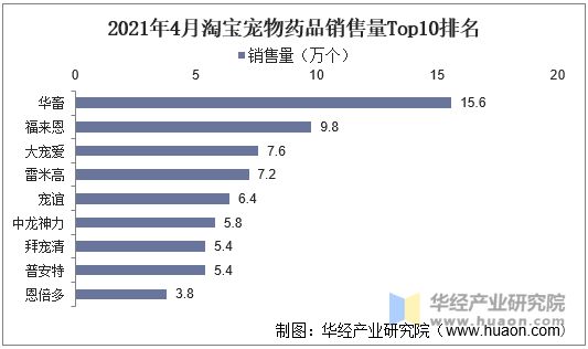 国产宠物药市场目前还未出现龙头公司,根据淘宝数据显示,2021年4月淘宝线上销量Top10中8个都是国产宠物药,其中国产品牌华畜销售量最高,达到15.6万个;其次为德国品牌福来恩,销售量达到9.8万个;而美国品牌大宠爱位居第四,销售量为7.2万个。