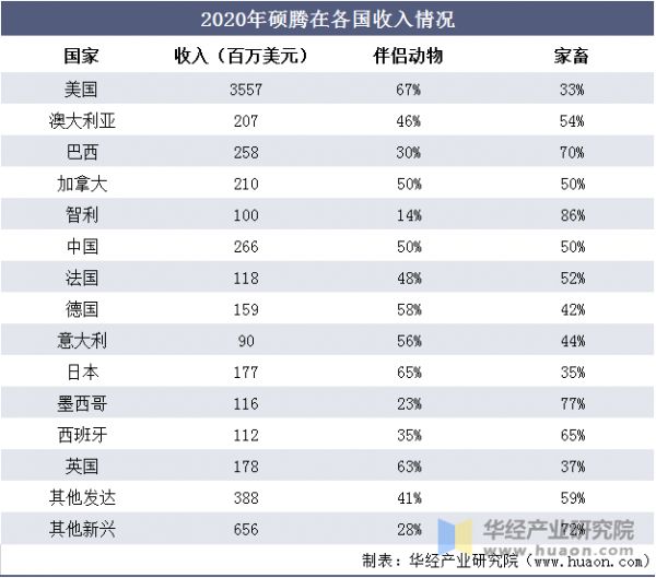 2020年世界动保公司龙头硕腾(Zoetis)收入为62.2亿美元,其中在美国的收入最高,为35.57亿美元,占总收入的一半以上,其中来自伴侣动物的收入占总收入的67%,来自家畜的收入的占总收入的33%。在中国的收入为2.66亿美元,其中来自侣动物的收入占总收入的50%,来自家畜的收入的占总收入的50%。
