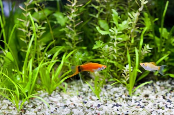 像孔雀鱼、玛丽鱼与月光鱼之类同样性格温和不具有攻击性的鱼和红剑尾鱼混养就特别合适。尤其是三种鱼的颜色与样式和红剑尾鱼相似,也非常漂亮,搭配起来能为水族箱增色不少。