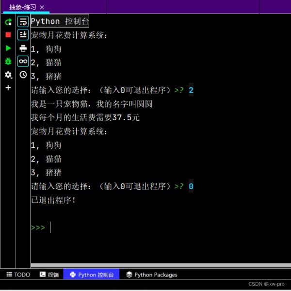 import abc class Pet(metaclass=abc.ABCMeta): def __init__(self, name, age): self.name = name self.age = age @abc.abstractmethod def mealPay(self): pass class Dog(Pet): def mealPay(self, name): print(f"我是一只宠物狗,我的名字叫{name}") money = 1*4*30 print(f"我每个月的生活费需要{money}元") class Cat(Pet): def mealPay(self, name): print(f"我是一只宠物猫,我的名字叫{name}") money = 0.25*5*30 print(f"我每个月的生活费需要{money}元") class Pig(Pet): def mealPay(self, name): print(f"我是一只宠物猪猪,我的名字叫{name}") money = 1.5*3*30 print(f"我每个月的生活费需要{money}元") while True: print("宠物月花费计算系统:n1, 狗狗n2, 猫猫n3, 猪猪") choice = input("请输入您的选择:(输入0可退出程序)") if choice == '0': print("已退出程序!") break if choice == '1': d1 = Dog('大壮', 3) d1.mealPay(d1.name) elif choice == '2': c1 = Cat('圆圆', 2) c1.mealPay(c1.name) elif choice == '3': p1 = Pig('嘟嘟', 2) p1.mealPay(p1.name) else: print("您的输入有误,请重新输入:")