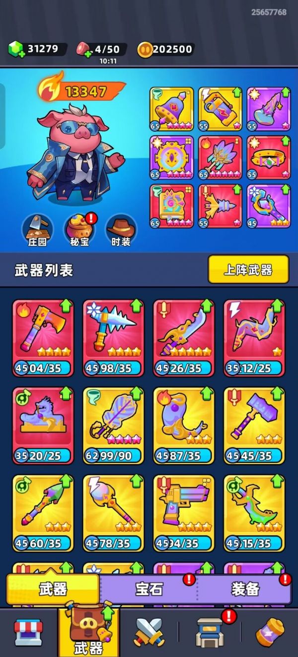 《口袋宠物猪》攻略之武器篇神话武器(红色)主要 朱雀扇(输出 穿 透) 御风书(禁锢 击退) 腰带(生命 极速恢复) 传说武器(金色)主要 芭蕉扇(击退 分裂) 磁暴手雷(减速(移动速度)) 铃铛(减速(攻击速度)) 史诗武器(紫色)主要 盾牌(血量 刷盾) 帽子(回血 增伤(限法术武器)) 寒冰杖(冰冻(BOSS只吃冰冻,减速和禁锢)) 蓝色武器主要 手套 (前期过度35级可以停止) 武器升级需要图纸和自身碎片 到一定等@青青同学官方10 赞 · 3 回复