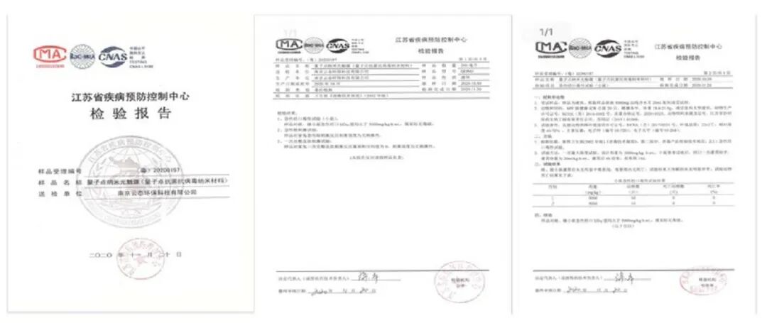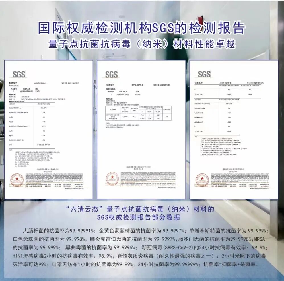 经国际权威检测机构SGS检测:量子点纳米光触媒(QDMJ系列)涂层对大肠杆菌、金黄色葡萄球菌、霉菌和霉菌毒素、白色念珠菌和肠沙门氏菌等大多数常见致病菌的灭菌率和抑菌率均达到了99.999%左右。经江苏省疾控中心急性经口毒性试验、急性眼刺激试验和一次完整皮肤刺激试验,“六清云态”量子点纳米光触媒(QDMJ系列)材料各项指标均达到了国家安全高等级别,对人体和宠物均无伤害性、无刺激性。