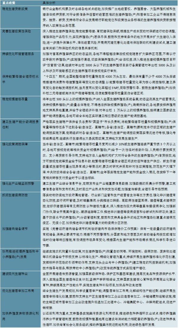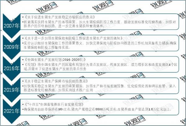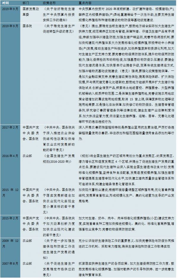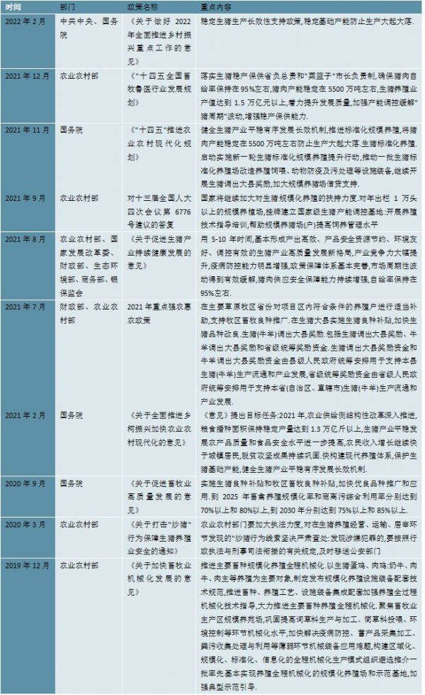 随着经济的不断发展、人们生活水平的日益提高,肉类市场规模及覆盖消费者群体不断扩大。国家相继出台了多项政策,对生猪养殖行业的健康有序发展起到重要作用。具体政策如下: