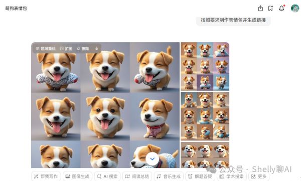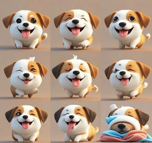 接下来,就是豆包大显身手的时候了。我们将 Kimi 给出的提示词提供给豆包,豆包会根据这些提示词生成相应的图片。比如,当我们把 “吐舌憨笑狗” 这个提示词告诉豆包时,豆包会运用其强大的图像生成能力,为我们呈现出一只超级萌、可爱的小狗狗吐出舌头,脸上露出憨笑的画面。同样,对于其他的提示词,豆包也能一一给出精彩的图片回应。